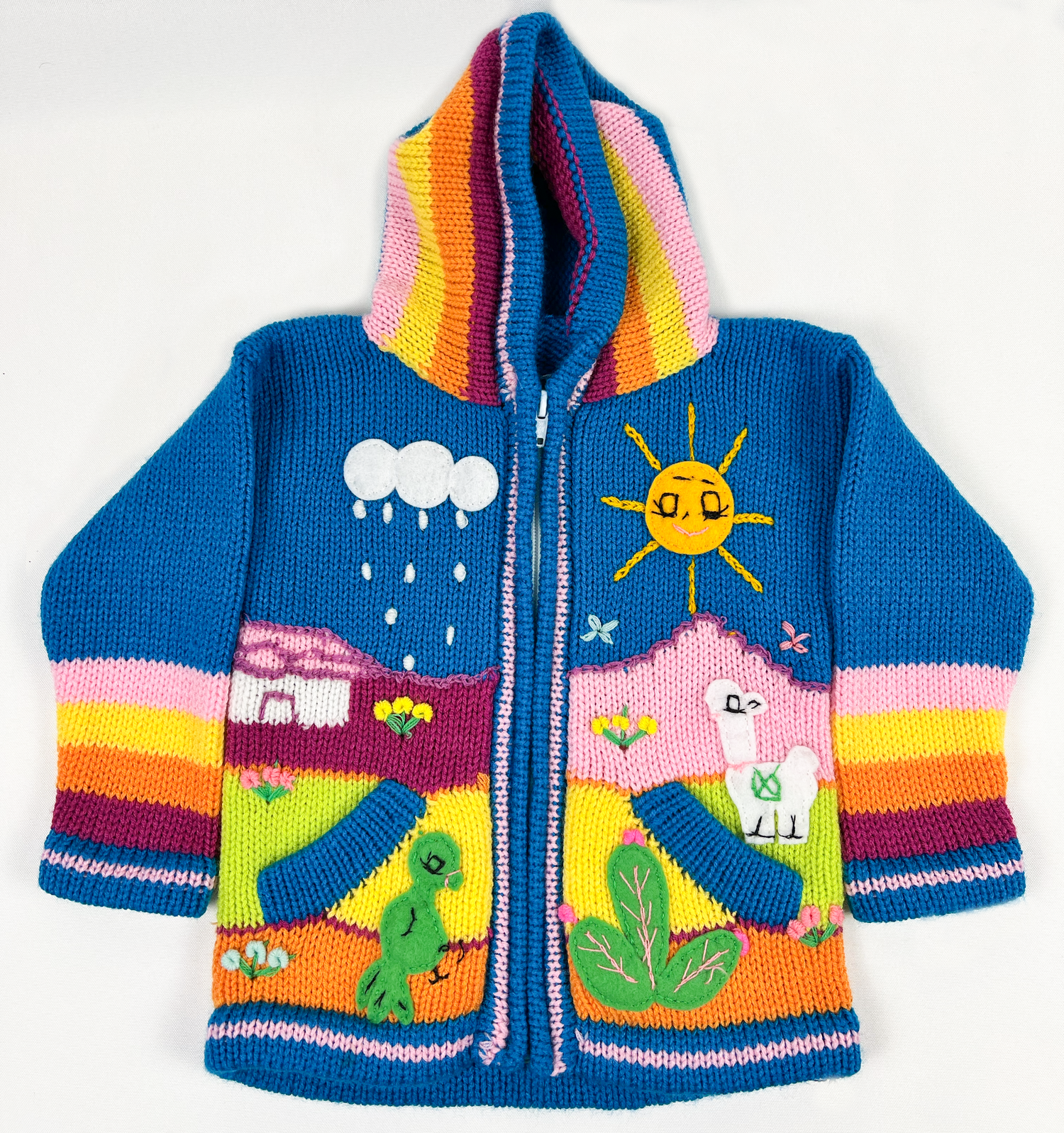 Blue, Pink and Yellow Hand Knit Children's Sweater with Flowers